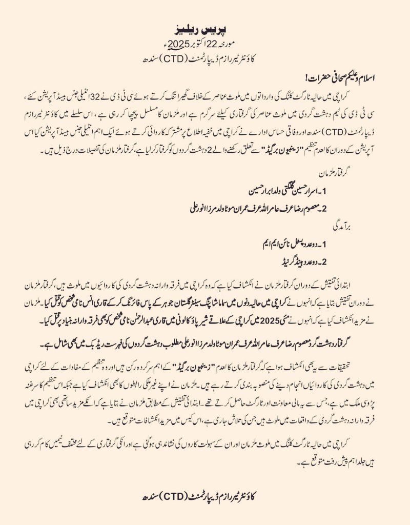 The Counter-Terrorism Department (CTD) Karachi has arrested two most-wanted terrorists affiliated with the Zainabiyun Brigade.
